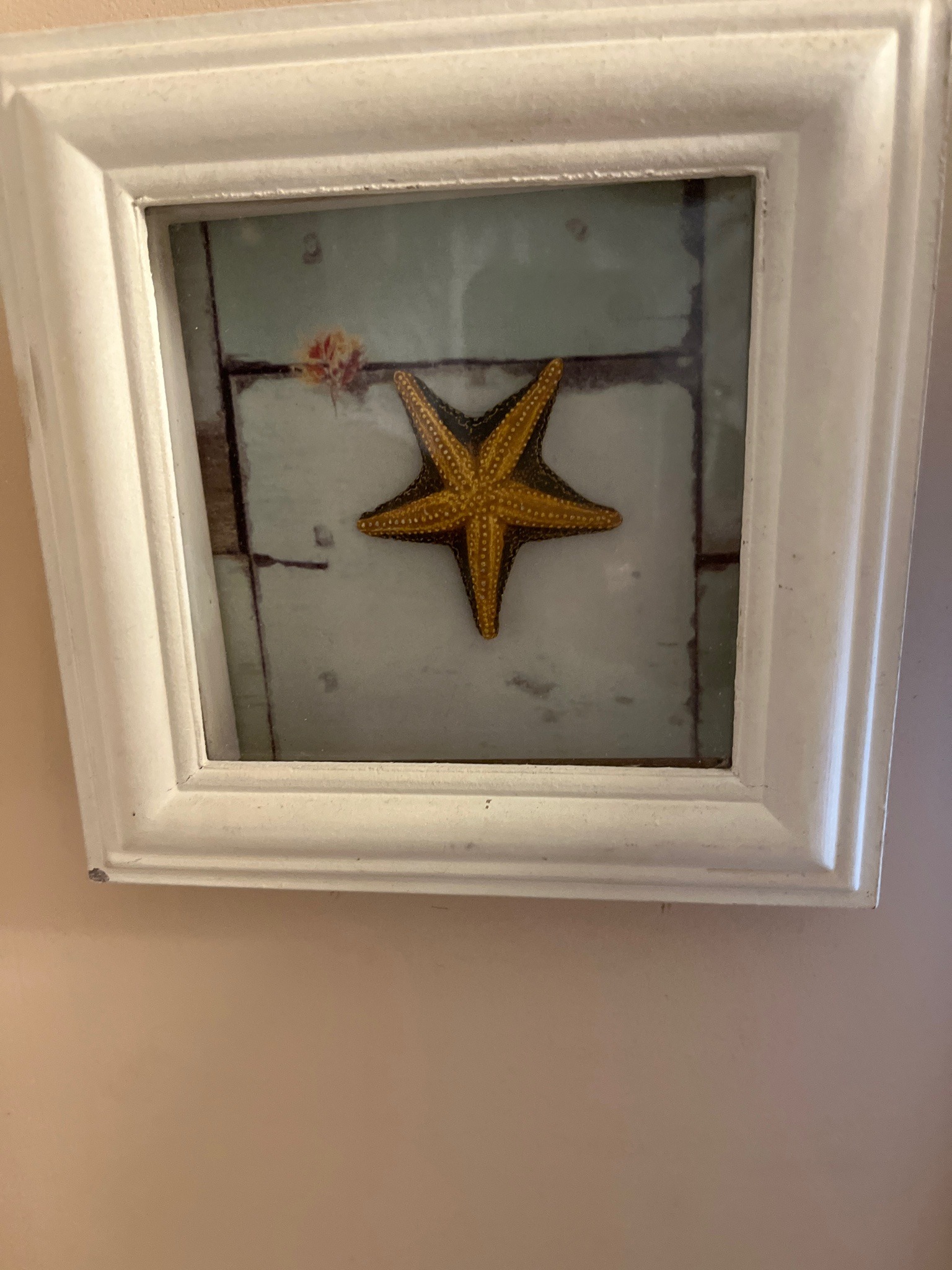 This item is a square framed piece of wall art featuring a central starfish motif. The starfish is rendered in a deep ochre or golden-brown hue with distinct white textural dots representing its anatomical bumps. It is set against a background designed to mimic weathered pale-blue or teal tiles with visible 'grout' lines and distressing, indicating a rustic maritime or shabby-chic aesthetic. To the upper left of the starfish is a small orange and red coral accent. The entire composition is housed within a deep, white-painted wooden or composite frame that provides a shadow-box effect. The frame shows significant wear, including visible scuffs, dirt, and paint loss on the lower-left corner and edges, suggesting it is a contemporary mass-produced decorative item rather than a fine antique. The glass appears to be standard non-glare or clear glazing reflecting ambient light. The construction is indicative of late 20th or early 21st-century home decor, likely produced for retail in a coastal-themed collection. No visible artist signature or maker's mark is present on the front face.