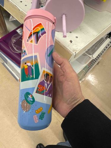 This is a tall, cylindrical insulated travel tumbler from Target’s recent LGBTQ+ Pride collection. The item is constructed from stainless steel with a glossy external finish and features a vibrant, multi-colored graphic wrap. The background of the design is a gradient blending from pastel pink at the top to a sky blue at the base. The artwork consists of various stickers and Polaroid-style photo motifs, including the Progress Pride flag, a same-sex couple in suits holding flowers, gummy bears, and a disco ball. The tumbler includes a solid pink matte-finish plastic lid with a secure flip-top or sliding closure mechanism. It appears to be roughly 10-12 inches in height with a narrow 'skinny' profile designed for portability. The condition appears to be excellent or 'new' with no visible scratches, dents, or fading to the printed graphics. The manufacturing reflects modern mass-production techniques for seasonal retail merchandise, likely produced around 2023. The internal lining is presumably double-walled vacuum-sealed steel, a standard for high-quality thermal retention in contemporary drinkware.
