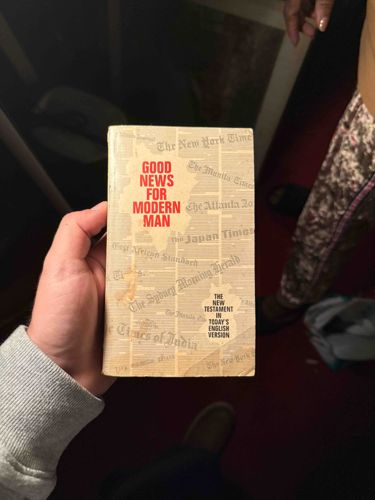 This is a vintage mass-market paperback edition of the 'Good News for Modern Man,' which is the New Testament translated into Today's English Version (TEV). The book features a distinctive cover design typical of the late 1960s or 1970s, consisting of a textured, newspaper-clipping background motif that includes mastheads from famous global publications like The New York Times, The Manila Times, and The Sydney Morning Herald. The title is printed in bold, red sans-serif block lettering, contrasting against the muted beige and gray tones of the background. Physically, the book is a pocket-sized paperback with a glued binding. The condition shows visible signs of age and handling; there is significant yellowing and foxing on the front cover, particularly a dark circular stain near the bottom left and general discoloration along the edges. The corners exhibit light bumping and shelf wear, and the spine edge shows some creasing. The paper stock appears to be acidic, contributing to the overall patina and darkening of the cover graphics. This specific version was famously published by the American Bible Society and became a landmark in accessible, modern-language scripture translation during the mid-20th century.