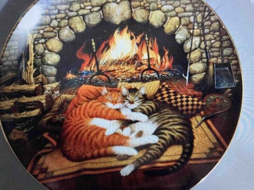 This is a circular porcelain collector plate featuring the artwork 'Catnapping' by the renowned Americana artist Charles Wysocki. The scene depicts a cozy, rustic hearth where two cats—one orange tabby and one brown tabby—are curled up together asleep on a patterned rug in front of a roaring stone fireplace. The composition is rich with domestic details including log piles, fireplace tools, a bellows, and a checkered pillow. The palette is dominated by warm earth tones, fiery oranges, and deep browns, characteristic of Wysocki’s folk-art style. The plate is constructed from fine porcelain with a smooth, glazed finish and typically measures approximately 8 inches in diameter. The artwork is applied via high-quality lithograph transfer, covering the entire top surface up to a thin gold-tone rim. Based on similar releases from The Bradford Exchange, this item likely dates to the 1990s. The Condition appears excellent with no visible chips, cracks, or crazing, and the colors remain vibrant with no significant fading. The craftsmanship reflects the mass-produced but high-standard quality of 20th-century commemorative dinnerware designed for display rather than functional use. The reverse of the plate would typically feature a unique firing number and information regarding the limited edition series.