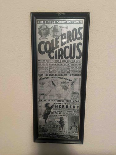 This item is a vertically oriented rectangular wall mirror featuring high-contrast black screen-printed graphics of a Cole Bros. Circus advertisement. The design is presented on a reflective silvered glass surface, housed in a simple, dark-stained wooden or composite frame. The graphic layout mimics a mid-20th-century circus poster, specifically from the late 1930s or early 1940s era, featuring portraits of Jess Adkins and Zack Terrell at the top. The central text highlights major acts and statistics of the show, including 'The Great Florenzo,' 'Dorothy Herbert,' and '50 Clowns.' Key visual elements include an illustration of a rearing horse and various acrobatic diagrams. The mirror shows minor age-related wear, with slight silvering degradation typical of vintage vanity or souvenir mirrors. The frame exhibits minor scuffing and dust accumulation, but the overall structural integrity remains sound. This piece appears to be a mid-to-late 20th-century reproduction or commemorative item intended for home decor, capturing the nostalgic aesthetic of the American traveling circus. The typography uses a mix of bold sans-serif and decorative script popular in period advertising.