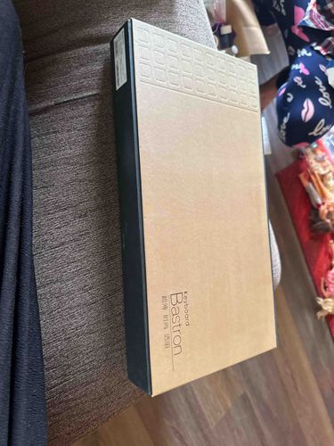 This item is the original retail packaging for a Bastron Glass Touch Keyboard. The box is rectangular and elongated, primarily constructed from a light kraft-brown textured cardboard lid paired with a matte black cardboard base. The lid features a unique debossed grid pattern at the top, mimicking the layout of keyboard keys. The branding 'Bastron' and 'Keyboard' is printed in a clean, sans-serif font along the bottom right edge, accompanied by Chinese characters. The side of the box contains a white manufacturer's sticker with technical specifications and barcodes. Based on the industrial design and branding, this item likely dates from the mid-2010s to the present, representing a modern aesthetic in consumer electronics. The packaging is in good condition with crisp edges, though there is a minor visible crease or denting on the lid surface. This type of keyboard is known for its high-quality construction involving tempered glass and aluminum frames, and the minimalist packaging reflects that premium positioning. There are no significant signs of moisture damage or fading, preserving the original tan and black contrast.