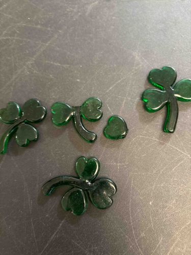 This set consists of four complete and one partial translucent emerald green glass shamrocks, likely intended for decorative or craft applications. Each shamrock measures approximately 1 to 1.5 inches in diameter and features a molded three-leaf design with a short, curved stem. The material is a mass-produced, soda-lime glass with a glossy finish. The construction exhibits a slight convex surface on the face and a flatter reverse side, typical of press-molded glass tokens or 'table scatter.' Notable features include the vibrant forest green color saturation and the organic, rounded edges of the heart-shaped leaflets. Regarding condition, there is significant damage present: one shamrock is broken into at least two pieces, with a detached single leaf visible in the center of the arrangement. The surfaces show minor scuffing, fingerprints, and internal seed bubbles indicative of a mid-to-late 20th-century manufacturing process. No maker's marks or signatures are present, suggesting these are generic retail items often sold in bulk for seasonal St. Patrick's Day displays or as vase fillers. The overall craftsmanship is consistent with functional, non-artisanal glass production, characterized by uniform color and standard mold-pressed shapes.