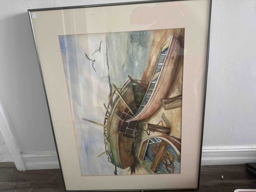 Framed Nautical Watercolor of Beached Boats