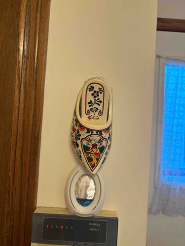 This item is a decorative wall-hanging ceramic miniature in the shape of a traditional Dutch wooden clog (klomp). It is crafted from glazed ceramic or porcelain with a smooth, white base finish. The surface is adorned with vibrant, colorful hand-painted or decal-applied motifs. On the toe, there is a central shield-shaped crest featuring a rustic scene with a windmill, which is a classic symbol of the Netherlands. The sides and the interior heel area are decorated with intricate floral patterns, specifically featuring blue delft-style flowers and greenery in shades of red, yellow, and green. The word 'Holland' is printed clearly on the interior base of the shoe. Physically, it appears to be a mid-to-late 20th-century souvenir item, likely mass-produced for the tourism market but still showing decent craftsmanship in the application of the glaze and pigments. The condition appears to be fair; there are visible signs of dust and minor surface grime along the edges, and the piece shows some crazing or fine lines in the glaze consistent with age. It is currently mounted on a wall above a plastic fixture, suggesting it serves as a decorative keepsake rather than an antique of high value. The construction is hollow, and it lacks visible maker's marks on the exterior aside from the geographic identification.