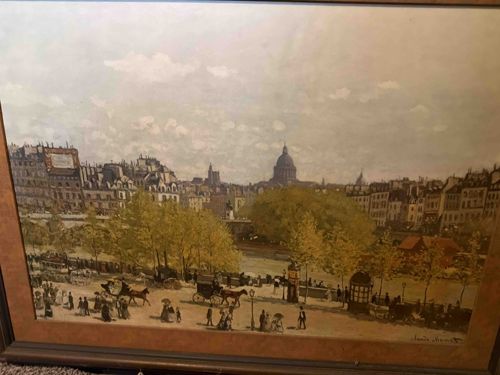 This item is a framed reproduction of the 1867 Impressionist painting 'Le Quai du Louvre' by Claude Monet. The piece depicts a bustling Parisian street scene featuring the Quai du Louvre in the foreground with horse-drawn carriages and pedestrians, and the dome of the Panthéon visible in the distant skyline. The color palette consists of muted ochre, sage green, and earthy browns, characteristic of Monet's early urban studies. The work is presented in a wide wooden frame with a decorative inner mat or liner that appears to have a faux-wood or marbled finish. While it contains a facsimile signature in the lower right corner, the surface texture suggests it is a high-quality print or lithograph rather than an original oil on canvas. The condition appears fair, though the frame shows signs of minor surface scratches and dust accumulation. The overall style reflects the mid-to-late 19th-century transition into Impressionism, though as a print, this specific object likely dates from the mid-to-late 20th century. The composition is well-balanced, capturing the atmospheric light and architectural density of historic Paris.