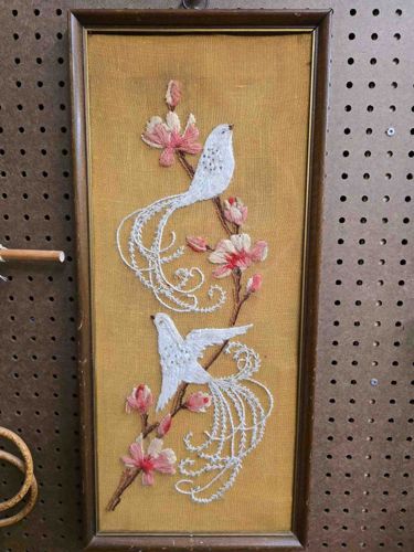 Vintage Framed Silk Embroidery Birds and Blossoms