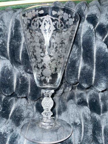 This is an elegant water goblet crafted by the Tiffin Glass Company, featuring the highly sought-after 'June' pattern, which was produced approximately between 1920 and 1950. The piece is made of clear, high-quality lead crystal, characterized by its brilliant clarity and resonant ring. The construction features a blown glass bowl with a slender, multi-faceted pressed stem containing a decorative knop or wafer-like detail, terminating in a wide flat base for stability. The bowl is decorated with a delicate 'June' acid etch, showcasing an intricate arrangement of romantic swags, bows, and floral bouquets of roses and daisies that encircle the top portion of the vessel. The etching is finely detailed with a frosted finish that contrasts beautifully against the transparent glass. Condition-wise, the goblet appears to be in excellent vintage state with no visible chips, cracks, or deep scratching to the bowl or foot. There is no evidence of 'clouding' or dishwasher damage, suggesting it has been well-cared for. The piece reflects the peak of the Depression-era Elegant Glass movement, displaying superior craftsmanship compared to mass-produced kitchenware of the same period.
