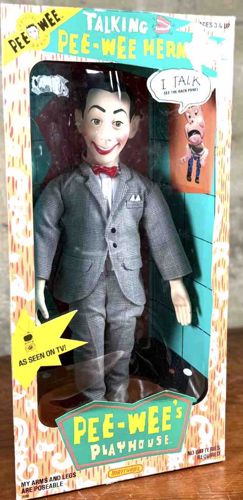 This is a vintage Talking Pee-wee Herman pull-string puppet, manufactured by Matchbox in approximately 1988 to coincide with the popular television series 'Pee-wee's Playhouse.' The figure stands approximately 17 inches tall and features a molded plastic or vinyl head with a highly detailed, painted expression capturing the character's likeness, including his signature grin and side-parted black hair. He is dressed in an authentic miniature version of his iconic gray windowpane patterned suit, white shirt, and red satin-like bow tie. The body is soft-stuffed with poseable limbs. A pull-string mechanism is located on the back to activate recorded voice clips. The item is housed in its original window-display box, which features colorful graphics of the Playhouse characters and the Matchbox logo. Notable condition issues include visible surface wear to the cardboard box, specifically some tearing and paper loss at the upper right corner of the front panel and edge wear along the bottom. The clear plastic window appears intact but may have minor scuffing. The figure itself appears to be in very good, used condition, though the functionality of the pull-string mechanism (a common point of failure for this age) is unknown from the image.