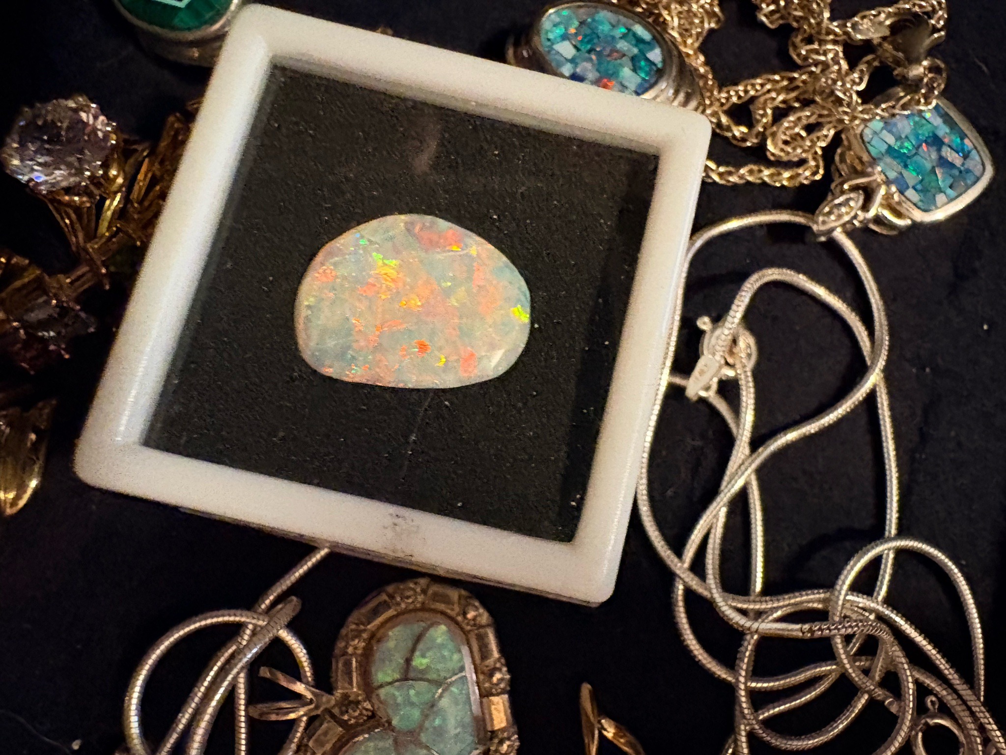 This is a natural loose crystal opal cabochon, presented in a white square gem jar with a black foam insert. The opal features an irregular, freeform semi-oval shape with a smooth, polished domed surface. It exhibits a vibrant play-of-color characterized by strong flashes of orange, red, green, and yellow across a translucent light-gray to white body tone. The most prominent pattern appears to be a broad flash or floral play-of-color. The stone's transparency indicates it is likely a crystal opal of Australian origin, though laboratory testing would be needed to confirm 'Coober Pedy' or 'Lightning Ridge' provenance. The surface appears to be in good condition with a high-luster polish, free from visible surface-reaching cracks or crazing, which is a common stability issue in opals. The surrounding context of silver jewelry and mosaics suggests a contemporary vintage age, likely 20th century. The quality is indicated by the high saturation of the warmer color spectrum (red and orange), which typically commands a higher value in the opal market than green or blue dominance.