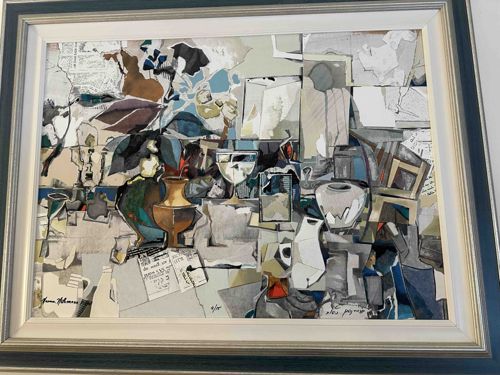 This item is a framed, contemporary mixed media collage on paper, executed in a Cubist-influenced style. The composition is a complex still life featuring various vessels, bottles, and plant forms rendered through fragmented, overlapping shapes. The color palette is sophisticated, utilizing muted earthy tones of ochre, sage, and grey, punctuated by deeper blues, blacks, and browns. Noticeable texture is created through the application of cut or torn paper elements, some of which feature faint typographic printed text resembling newsprint or ledger pages. The artwork is signed in the lower left corner as 'Pierre Yohana' (or similar) and appears to be marked with a fractional edition number '8/150' near the center-bottom, suggesting it is a limited edition lithographic print or embellished serigraph. The piece is professionally housed in a multi-layered frame comprising an inner white-painted bevel and a broad, metallic exterior moulding with dark grey/green accents. The condition appears excellent with no visible foxing, fading, or moisture damage. The craftsmanship reflects high-quality contemporary printmaking and framing techniques likely from the late 20th or early 21st century.