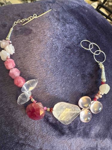 This is a handcrafted artisan bracelet featuring a diverse assortment of multi-shaped semi-precious gemstones, identified as chalcedony. The piece showcases a sophisticated palette of soft rose pink, translucent white, and a deep raspberry red center stone. The construction utilizes various bead shapes, including faceted round briolettes, carved floral floral motifs, polished pebbles, and faceted geometric beads. The centerpiece is a large, translucent white freeform slab bead adjacent to a large faceted deep pink rondelle. These larger elements are separated by minute silver and darker pink accent seed beads. The findings are made of sterling silver, featuring decorative conical end caps that lead to a toggle-style clasp. One end has a simple bar, while the other features three large adjustable jump rings for varied sizing. The condition appears excellent with no visible chips to the stone edges or heavy tarnish on the metal. This piece reflects a contemporary bohemian style, likely contemporary or late 20th century in origin. The hand-knotted or high-tensile wire strand ensures structural integrity, while the variety of chalcedony cuts suggests a custom or boutique artisan production rather than mass-market manufacture.