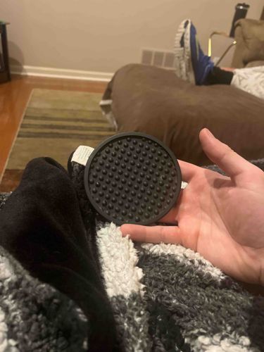 This item is a circular, matte black disc constructed from a flexible, high-friction synthetic polymer, most likely silicone or a specialized vulcanized rubber. It measures approximately 3.5 to 4 inches in diameter based on its scale relative to the human hand. The primary design feature is an intensive grid of raised hemispherical 'nubs' or studs covering the entire interior surface, surrounded by a distinct raised outer rim. This textured pattern is designed to provide maximum grip and aeration, common in drink coasters to prevent glass suction or in furniture foot pads to prevent sliding on hardwood floors. The construction appears to be a single-mode injection-molded piece, ensuring durability and water resistance. There are no visible maker's marks or logos on the upper surface, suggesting a mass-produced utilitarian origin from the contemporary era (21st century). The condition shows light surface dust and minor lint accumulation within the recesses of the studs, typical of household use, but there are no signs of material cracking, warping, or degradation of the outer lip. The uniform color and lack of branding prioritize function over decorative aesthetics, though the matte finish offers a modern, minimalist look suitable for various interior styles.
