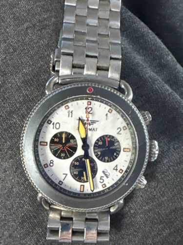 This is a vintage Breitling Chronomat automatic chronograph wristwatch, likely dating from the 1990s. The piece features a prominent stainless steel case with a fluted or coin-edge unidirectional rotating bezel, distinguished by a red dot marker at the 12 o'clock position. The dial is a white/silver 'panda' style, housing three sub-dials at the 6, 9, and 12 positions, which serve to track cumulative time intervals. Notable aesthetics include yellow and black sword-style hands and a date window located between the 4 and 5 o'clock positions. The watch is fitted with a multi-link stainless steel 'Rouleaux' or 'Bullet' style bracelet, which was a signature design choice for Breitling during this era. Regarding condition, the watch shows significant signs of wear consistent with regular use. There are visible surface scratches and 'scuffs' on the bezel, case, and bracelet links. The crystal appears somewhat cloudy or scratched, potentially affecting legibility. The dial shows some possible spotting or patina typical of aged luminant. The presence of the wing logo and the 'AUTOMAT' text on the dial confirms its mechanical nature. The craftsmanship represents high-end Swiss horology, though the current visible wear would require professional servicing and polishing to restore its original luster.