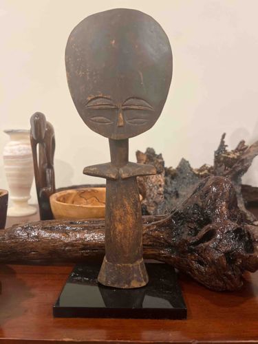 This is a hand-carved wooden sculptural figure known as an Akua'ba, originating from the Ashanti (Asante) people of Ghana. The figure is characterized by its prominent, oversized discoid head which represents beauty and intelligence in Ashanti culture. It features a long, ringed neck symbolizing wealth and health, a slender columnar body with small horizontal projecting arms, and a flared base. The face is carved with minimalist features, including high-arched brows, almond-shaped eyes, and a small, narrow nose. The wood displays a dark, aged patina with a rich brown luster, indicating a significant age, likely mid-20th century. Notably, the surface shows signs of authentic wear, including small abrasions and softening of carver's marks consistent with handling. There are no visible maker's marks, which is typical for such communal and ritualistic items. The craftsmanship exhibits steady hand-carving techniques, with a slight asymmetry that highlights its organic, handcrafted origin. The figure is mounted on a modern black rectangular display base, suggesting it has been part of a private or gallery collection.