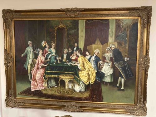 This is a large-format horizontal oil on canvas depicting a social interior scene, likely set in the 18th century but executed in the late 19th-century academic revival style. The painting shows a group of Aristocratic figures gathered around a green felt-covered card table. The figures are dressed in elaborate rococo-period attire, including powdered wigs, silk gowns in shades of pink, yellow, and blue, and embroidered frock coats. The composition is rich in detail, showcasing a servant entering from the right, ornate interior architecture with gilded mirrors, and a heavy patterned rug underfoot. The brushwork appears deliberate and realistic, typical of European genre painters like those of the French or Italian schools of the 1800s who romanticized the 'Ancien Régime'. The canvas is housed in a substantial, ornate gilded wood and gesso frame, featuring acanthus leaf corner flourishes and a bead-and-reel inner border. Condition-wise, the frame shows some minor gesso loss and cracking consistent with age, while the canvas surface appears to have a slightly darkened varnish layer and potential light craquelure typical of 19th-century oils. The overall craftsmanship is high, focusing on light reflecting off silk fabrics and the theatrical interaction of the figures.