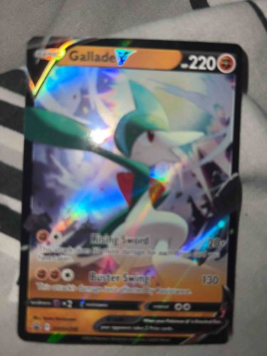 This is a Pokémon Trading Card Game (TCG) collectible featuring the character Gallade V. It is an Ultra Rare 'Full Art' styled card from the Sword & Shield: Lost Origin expansion set. The card measures approximately 3.5 by 2.5 inches and is constructed from multi-layered cardstock with a holographic finish. The artwork depicts a dynamic, stylized pose of Gallade with a metallic rainbow sheen reflecting across the surface. At the top, the name 'Gallade V' is visible with an HP of 220. The card lists two specific moves: 'Rising Sword' and 'Buster Swing.' Notable features include the black border and the holographic 'V' symbol. In terms of condition, the image shows significantly damaged edges with severe peeling and fraying on both the left and right sides. There appears to be heavy surface wear and potential creasing, which drastically impacts the collectibility and grade of the item. The card likely dates from 2022, based on the Lost Origin release cycle. The bottom left corner shows the set symbol and card number (062/196), confirming its identity within the series.