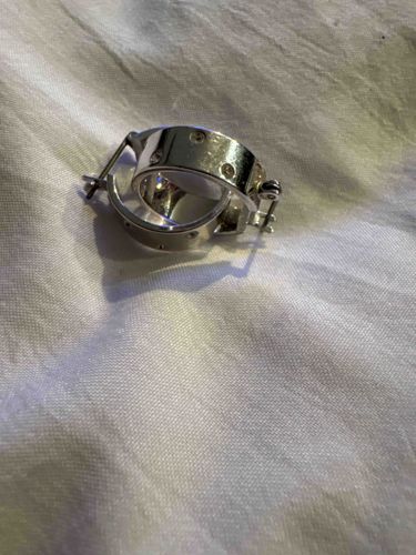 These are a pair of silver-toned hoop earrings designed in the iconic 'Love' style, characterized by a flat, wide band and recessed screw-head motifs encircling the outer circumference. The earrings feature a hinged closure mechanism with a straight post that snaps into a notched catch, typical of modern high-quality hoop designs. Physically, they exhibit a high-polish metallic finish, likely sterling silver, white gold, or a silver-plated base metal. The screw motifs are precisely spaced, suggesting careful manufacturing, though individual hallmarks or maker's marks are not clearly visible in the provided image. The interior surface appears smooth and well-finished. In terms of condition, there are visible surface micro-scratches and minor smudges consistent with gentle wear and handling. No deep gouges, significant tarnishing, or structural deformation is apparent. The aesthetic is contemporary and minimalist, heavily inspired by mid-20th-century luxury jewelry design. The items appear to be of solid construction with substantial thickness to the bands, indicating a higher quality of craftsmanship compared to hollow fashion jewelry.