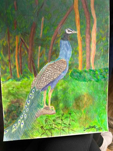 This is an original representational drawing of a peacock, created using colored pencils or pastels on a rectangular white paper substrate. The composition features a blue peacock standing in profile towards the right, positioned against a dense landscape background of green foliage and vertical brown/orange tree trunks. The peacock's neck is a vibrant cerulean blue, leading down to a brown-patterned wing and a long, trailing tail adorned with stylized 'eyes'. The artist utilized a heavy, linear hatching technique to build color and texture throughout the piece. The drawing is signed in the lower right corner with the name 'Brittany' and the year '2016' in black ink. The artwork appears to be a contemporary amateur or student-level piece, showing a dedicated focus on nature and wildlife. The condition appears fair to good; the paper edges are mostly intact, though there may be minor handling creases typical of unframed works on paper. The color saturation is high, suggesting the use of waxy colored pencils or soft pastels which have been layered extensively to cover the paper surface.