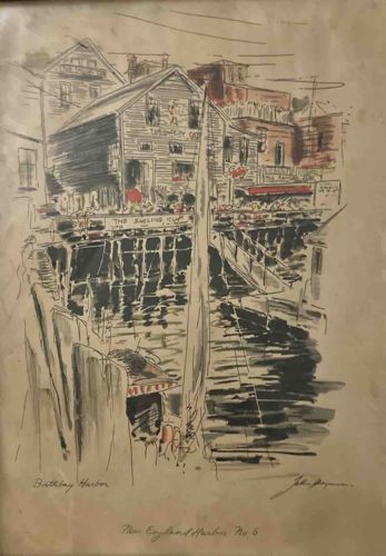 This is a vintage fine art harbor scene print or mixed-media work by the artist John Haymson (1902–1980). The work depicts a bustling waterfront in Boothbay Harbor, Maine, featuring the iconic 'Smiling Cow' gift shop. The piece is executed in a sketch-like, illustrative style characteristic of Haymson, utilizing thin black ink outlines and washes of muted color, including ochre, red, and blue. The composition is vertical, emphasizing the tall mast of a boat in the foreground and the reflections of the pier in the water. Handwritten inscriptions at the bottom identify the location as 'Boothbay Harbor' on the left and the title 'New England Harbor No. 6' in the center. An artist signature, 'John Haymson', appears on the bottom right. The paper shows significant signs of age, including overall yellowing/toning and visible foxing (brown spotting) concentrated along the edges. The style suggests mid-20th-century American commercial illustration transitioning into art for the home. The craftsmanship shows confident line work and atmospheric rendering typical of mid-century harbor studies.
