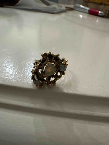 This is a distinctive piece of statement jewelry consisting of a gold-toned modernist ring, likely crafted in the late 1960s or 1970s. The ring features a highly textured 'brutalist' aesthetic, characterized by its organic, nugget-like casting that mimics volcanic rock or molten metal. Centered within this complex structure is a prominent pear-shaped or teardrop-shaped opal cabochon showing a play of color with flashes of orange and green. This primary stone is flanked by at least two smaller round opal cabochons integrated into the asymmetrical, open-work mounting. The metal appears to be yellow gold, likely 10k or 14k based on the style, though no hallmark is visible in the photograph. The craftsmanship displays the 'lost wax' casting technique common in hand-crafted jewelry of this era. Regarding condition, the metal shows a slight patina consistent with age, and the opals appear intact, though one must check for crazing or surface scratches typical of soft gemstones. The overall construction is heavy and sculptural, representing high-quality artistic metalwork from the Mid-Century period.