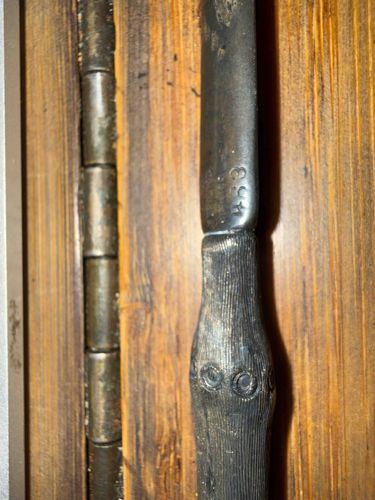 This object is a slender, metallic tool, likely a stylus or a specialty scribe, resting against a wooden background near a heavy-duty hinge. The item features a narrow, flat-bladed upper section where a numerical inscription, '463', is clearly stamped or engraved into the dark, patinated surface. Below this, the handle swells into a bulbous grip characterized by a deeply vertical, wood-grain-like texture cast or carved into the metal. A series of stamped circular decorative motifs or 'eyes' encircle the widest part of the handle, providing both aesthetic interest and tactile grip. The material appears to be a dark cast metal, potentially bronze or iron, showing a significant aged patina with hints of dark gray and bronze-toned oxidation. The overall condition shows wear consistent with age, including surface irregularities and some accumulation of dust or debris in the textured recesses. The vertical wood grain of the lid and the oxidized metal hinge suggest this tool may be part of a larger wooden case or chest assembly, possibly dating from the late 19th to early 20th century. The craftsmanship indicates a functional yet decorative industrial or artisanal design, used for marking or as a lever.