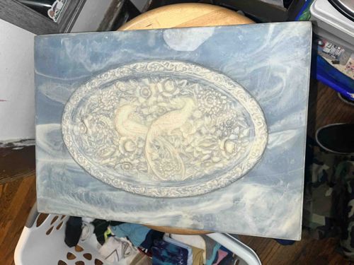 This rectangular keepsake box features a distinctive marbled blue-and-white resin construction with a decorative bas-relief lid insert. The lid is dominated by an oval central medallion depicting two birds, likely peacocks, amidst a lush floral background. This relief is rendered in a contrasting off-white or cream-colored cast material, possibly resin or a similar composite, surrounded by an ornate scrolling border. The main body of the box exhibits a swirling pattern intended to mimic natural stone such as marble or lapis lazuli. The craftsmanship suggests a mid-to-late 20th-century origins, common in decorative giftware of the 1970s and 80s. Physically, the item shows signs of age-related wear, including surface clouding and minor scuffing on the marbled exterior. The central relief portion appears slightly dusty and may have small losses in the finer floral details. There are no visible maker's marks or signatures on the top surface, though it's typical for such items to have felt padding or stickers on the base. The overall aesthetic is one of Hollywood Regency or eclectic vintage decor, utilizing molded materials to achieve a classical appearance.