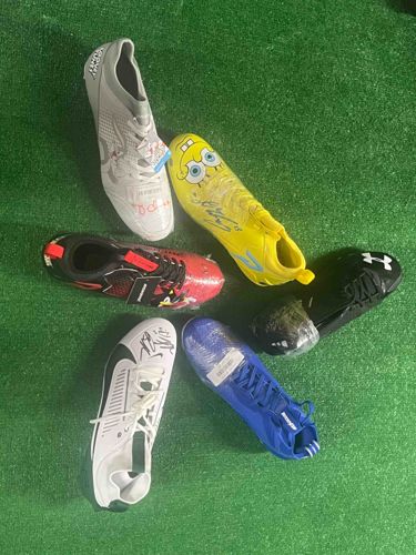 A varied collection of six athletic cleats, primarily American football style, displayed on a green synthetic turf background. The collection features several high-profile brands and unique customizations. Notable items include a bright yellow cleat featuring the likeness of SpongeBob SquarePants with a prominent blue ink signature, and a white Nike Alpha Huarache cleat with multiple black ink signatures. Other brands visible include Under Armour (black cleat with white logo) and Adidas (deep blue cleat wrapped in protective plastic). The white cleat at the top left features 'Looney Tunes' branding on the heel and a red ink signature on the toe box. A red and black 'Under Armour' cleat also features custom graphics. The cleats appear to be in excellent, often new-with-tags or wrapped condition, suggesting they are collector's items or memorabilia rather than game-worn equipment. Materials include high-performance synthetic meshes, knitted collars, and glossy TPU plates. Craftsmanship varies by manufacturer, but these represent contemporary professional-grade athletic footwear. There are no significant signs of wear, such as grass stains or scuffing on the plates, which enhances their value as display pieces.