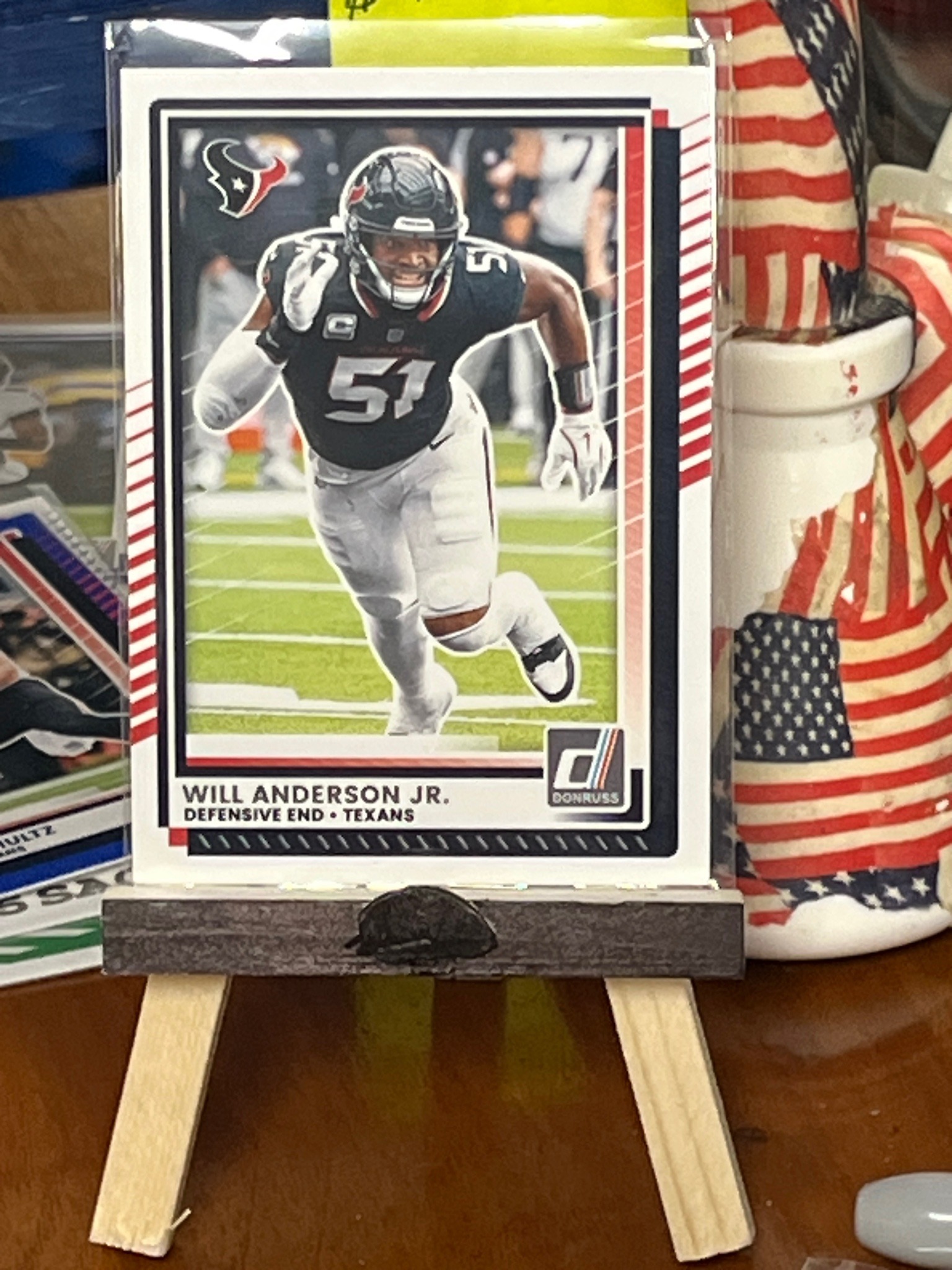 This is a 2023 Donruss base football trading card featuring Will Anderson Jr. of the Houston Texans. The card measures a standard 2.5 by 3.5 inches and is constructed from glossy cardstock. It depicts a full-action shot of Anderson Jr. in his home navy blue Texans jersey with the number '51' clearly visible. The design features a white border with a sharp navy blue inner frame, accented by red and white diagonal stripes on the left and right margins, a hallmark of the Donruss brand aesthetic. The bottom left identifies the player as 'WILL ANDERSON JR.' followed by his position 'DEFENSIVE END • TEXANS'. The iconic 'Rated Rookie' Donruss 'D' logo is positioned in the bottom right corner. The Texans' primary bullhead logo is displayed in the top left. The card appears to be in Excellent-Mint condition, housed in a protective clear plastic sleeve and displayed on a miniature wooden easel. Visible centring appears slightly weighted toward the left border. The corners appear sharp with no significant fraying or whitening visible through the sleeve. The surface shows a clean gloss with no apparent scratches or printing defects. The manufacturing year is 2023, produced by Panini under the Donruss license.