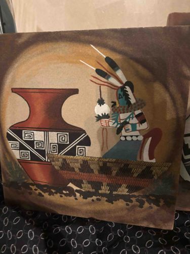 This is a traditional Navajo sandpainting executed on a square board, measuring approximately 12 by 12 inches. The piece utilizes finely ground, naturally colored sands and pigments to create a textural, matte surface. The central composition features a highly detailed Kachina figure in traditional regalia including feathered headdress and ornate necklaces, set behind a ceremonial basket and adjacent to a large olla-style ceramic vessel with geometric Greek key patterns. The color palette is earth-toned, emphasizing terracottas, ochre, white, black, and turquoise. The background maintains a circular halo effect that draws focus to the central figures. In terms of condition, the item shows some edge wear and minor surface abrasions consistent with age, likely dating it to the mid-to-late 20th century. The craftsmanship is highly detailed, visible in the precision of the line work and the consistent density of the sand application. While no signature is immediately visible on the front, these works are often signed on the reverse with the artist's name and tribal affiliation. This piece represents a secularized version of traditional Navajo healing sandpaintings made for the commercial art market.