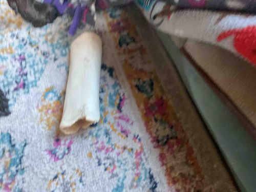 This item is a natural animal marrow bone, likely derived from beef, repurposed as a canine chew toy. It features a cylindrical, hollow structure characteristic of long bones, with a smooth exterior shaft and porous trabecular bone structure visible at the fractured ends. The color is predominantly an off-white to cream hue, showing typical organic variations and superficial staining from use. Notable features include the uneven, weathered edges at the base where the bone reflects significant chewing activity. The condition is categorized as heavily used or 'well-loved,' exhibiting significant wear consistent with the user's description. The surface shows a slightly polished patina from handling and contact with saliva, while the interior marrow cavity has been completely cleared. There are no man-made markings, signatures, or branding visible, as is common with organic pet supplies. This type of toy is valued for its durability and dental hygiene benefits for large breeds. The craftsmanship is purely biological, though the ends appear to have been mechanically cut or sanded originally to prevent sharp splintering, a standard safety practice for commercially sold marrow bones.