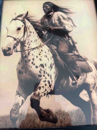 This item is a contemporary framed photographic print depicting a Native American man with long, flowing hair riding a galloping Appaloosa horse. The image serves as a romanticized portrayal of Western or Indigenous life, utilizing a warm, sepia-toned or desaturated color palette to evoke a sense of historical nostalgia. The subject is shown wearing traditional-style fringed buckskin or leather garments and a light-colored tunic, riding bareback or with a minimalist saddle pad. The horse is a distinctive leopard Appaloosa, characterized by numerous dark spots over a white coat. The print is housed behind glass in a simple, dark-colored (likely black or dark brown) frame. The construction appears to be modern, common for home decor items found in specialty retail stores. There are no visible maker's marks, signatures, or limited edition numbers on the face of the image, suggesting it is an open-edition decorative print rather than a fine art photograph or an original historical archive. The condition appears fair, with the framing intact; however, there is a prominent vertical reflection across the center of the glass in the photograph provided. No significant foxing, fading, or moisture damage is immediately apparent, though the aged 'look' of the image is a stylistic choice rather than a result of physical age. The piece likely dates from the late 20th to early 21st century and is designed in a Western or Southwestern aesthetic.