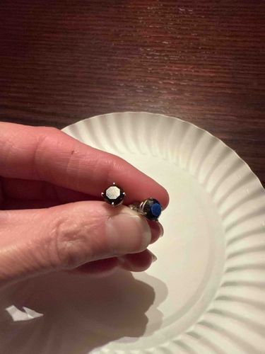 This item consists of a pair of stud earrings featuring round brilliant-cut black gemstones, likely black diamonds, spinels, or onyx, estimated at approximately 1.0 to 1.5 carats each based on their scale relative to the fingertips. The stones are secured in four-prong basket settings made of a white-colored metal, such as sterling silver, white gold, or platinum. The metal displays a bright, polished finish with no immediate signs of heavy oxidation or tarnish, suggesting high-quality plating or a noble metal composition. The gemstones exhibit a high luster and sharp facet edges, with one stone reflecting a distinct blue light, which could indicate a specific treatment, a coating, or the reflection of nearby ambient light. Physically, the studs appear to be contemporary in style, characterized by a minimalist aesthetic that emphasizes the stones over the metalwork. The earrings are held between fingers against a white fluted plate/surface, showing their small, portable scale. No structural damage is visible; the prongs appear symmetrical and intact, firmly gripping the girdles of the stones. There are no visible maker's marks or hallmarks in this view, though they would typically be found on the earring posts or friction backs. The overall craftsmanship appears consistent with modern commercial jewelry production.