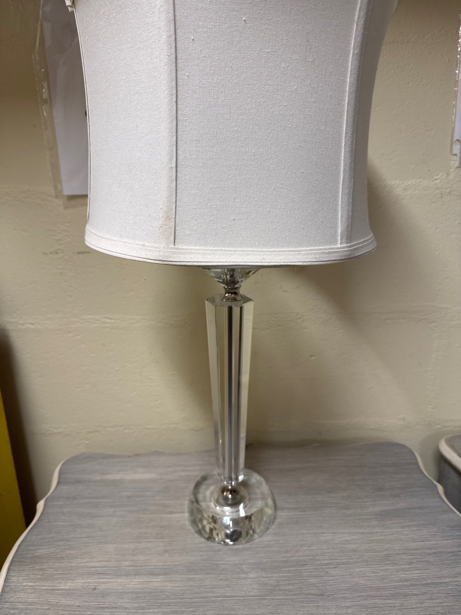 This is a contemporary table lamp featuring a sculptural, clear crystal base and a white fabric drum shade. The base is constructed of high-quality lead crystal or optical glass, designed in a tapered hexagonal obelisk shape that rises from a weighted, circular crystal pedestal. The central shaft is sleek and faceted, capturing and refracting light through its transparent body. The lamp is capped with a polished nickel or chrome-finished neck that secures a classic, white linen-texture fabric shade. The shade has vertical piping and a slight flare at the base, providing a soft diffusion of light. In terms of condition, the crystal appears well-maintained with no visible chips or cracks, though there is some minor spotting or staining visible on the lower left portion of the fabric shade. The metal hardware shows a clean, bright finish without significant pitting or oxidation. This piece represents a Transitional or Modern Glamour style, likely produced in the late 20th to early 21st century. The craftsmanship is evident in the precision of the crystal facets and the substantial weight suggested by the thick base, indicating a mid-to-high-end decorative accessory suitable for residential interiors.