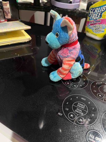 This item is a small, seated plush toy representing a dog, characterized by its vibrant and eclectic patchwork design. The plush exhibits a multi-colored aesthetic with segments in bright blue, mottled pink and orange, and black-and-blue spotted patterns. The dog features a teal-colored muzzle, upright triangular ears with cream-colored inner linings, and a small black embroidered nose. Its eyes appear to be small, dark plastic buttons or safety eyes. A notable feature is the red collar detail around its neck. The construction utilized diverse fabric panels, likely synthetic polyester plush or fleece, sewn together to create a whimsical, mismatched look. The front legs show a horizontal orange and light pink striped pattern, adding to the visual complexity. Regarding condition, the toy shows signs of moderate wear consistent with age and play; the plush fur appears slightly matted and pilled in various areas, particularly around the head and paws. There is noticeable discoloration or light surface soiling on the teal muzzle and paws. No manufacturing tags or 'heart tags' are visible in the image, though the style is reminiscent of early 2000s novelty plush toys such as those from the Ty Beanie Babies or similar bean-bag toy lines. The craftsmanship is standard for mass-produced commercial plushies of that era.