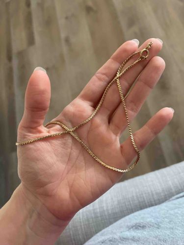This item is a contemporary yellow gold-tone chain necklace, featuring a classic Franco style link construction. The Franco design is characterized by its tightly interwoven V-shaped patterns, creating a sturdy, four-sided aesthetic that offers high durability and a smooth feel against the skin. The metal exhibits a bright, polished yellow gold finish which suggests it is either solid 14k/18k gold or a high-quality gold plating. The chain is fine to medium in thickness, approximately 1.5mm to 2mm in width, and appears to be roughly 18 to 20 inches in length given its drape in the palm of the hand. It is secured with a standard spring ring clasp mechanism. Upon close inspection, the links appear uniform with no visible kinks, breakages, or worn-down solder joints, indicating good maintenance. There are no readily visible maker's marks or purity hallmarks in the provided image, though these would typically be found on the small circular tag near the clasp. The overall condition is excellent with a consistent luster and minimal surface scratching, typical of light previous wear. This style is a timeless jewelry staple, often worn alone for a minimalist look or paired with a pendant.