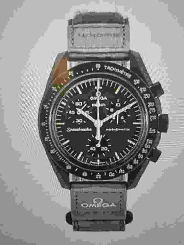 This is a contemporary chronograph wristwatch from the popular 'MoonSwatch' collaboration between Swatch and Omega. The timepiece features a matte black 'Bioceramic' case, a proprietary blend of ceramic and castor-based plastic, designed to mimic the aesthetic of the iconic Omega Speedmaster Moonwatch. It measures approximately 42mm in diameter and includes the signature tachymeter scale on the bezel. The dial is black with recessed sub-dials for chronograph functions, luminous baton indices, and white 'pencil' shaped hands. Notable markings include both the 'OMEGA' and 'SWATCH' logos at the 12 o'clock position, along with the 'Speedmaster' and 'MoonSwatch' branding. The watch is presented on a grey velcro strap with white branding. Regarding condition, the Bioceramic material is prone to light scuffing, though none is immediately prominent in this low-resolution view. This specific model, 'Mission to the Moon', is the most accurate visual homage to the original steel Speedmaster. It utilizes an ETA quartz movement, characteristic of Swatch's more accessible manufacturing process compared to Omega's high-end mechanical movements. The craftsmanship is typical of modern mass-market horology, balancing affordable materials with iconic heritage design language.