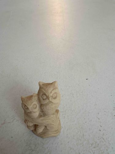 This is a small decorative figurine depicting two owls perched side-by-side on a rustic branch. The piece is crafted from a matte, off-white material that appears to be either carved soapstone, a molded resin, or a composition of crushed stone. The sculpture measures approximately 2.5 to 3.5 inches in height and features a monochromatic, light-beige or cream color palette with a textured finish. The construction is solid and cast in a single piece. The larger owl on the right and the smaller owl on the left are stylized with prominent circular eyes, pointed auricular tufts (ears), and feathered texturing on their chests and wings. The branch base shows organic, wood-like striations. Regarding condition, the item shows signs of age with accumulated dust and light surface grime in the crevices of the carving, which serves to highlight the textured details. There are no obvious large chips or cracks visible in the primary structure, though the surface has a slightly weathered patina. The style is reminiscent of mid-to-late 20th-century giftware (circa 1970s-1980s), likely mass-produced but designed to mimic artisanal hand-carving. No maker's marks or signatures are visible from this angle, but such items were commonly produced by companies like Enesco or Hosley in various stone-imitation materials.