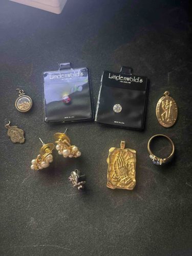 A diverse collection of jewelry and loose gemstones, featuring a variety of materials and motifs. The assembly includes two Lindenwold's fine jewelry packages containing loose faceted stones, one appearing to be a ruby-colored gemstone and the other a clear stone, likely a diamond or high-quality cubic zirconia. Religious items are prominent, specifically a gold-toned St. Christopher medal and a rectangular 'Praying Hands' pendant with a textured nugget-style border. Also present is pair of gold-toned cluster earrings featuring cream-colored imitation or cultured pearls accented by small clear stones. A gold-rimmed circular glazed locket contains small golden-colored interior elements. The lot also features a gold-toned ring set with small clear stones and a smaller religious charm. Materials appear to be a mix of suspected yellow gold (to be verified for karat), base metals, pearls, and synthetic or natural gemstones. Condition varies across the pieces; some show minor surface scratches, while the 'Praying Hands' pendant retains a bright finish. The presence of the Lindenwold's branding suggests some pieces may be mid-to-late 20th-century commercial jewelry.