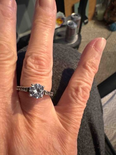 This item is a classic-style engagement ring featuring a round brilliant-cut center stone, likely a diamond or high-quality simulant, secured in a traditional four-prong setting. The center stone exhibits a high degree of brilliance and fire, suggesting a well-proportioned cut. The ring's band is a tapered 'cathedral' or shoulder style, contemporary in design, adorned with a pavé or micro-set row of smaller round accent stones along the upper half of the shank. The metal appears to be a bright white precious metal, such as 14k or 18k white gold or platinum, though no hallmark is visible in the image. In terms of condition, the ring appears to be in good wearable condition with no missing accent stones or obvious prong damage visible. The craftsmanship shows precise stone setting with uniform prongs. The style is indicative of modern bridal jewelry from the late 20th century to the present. The center stone's size is estimated between 1.0 to 1.5 carats based on finger proportions. Professional cleaning and a loupe inspection would be required to confirm the species of the stones and clear identification of metal stamps on the inner shank.
