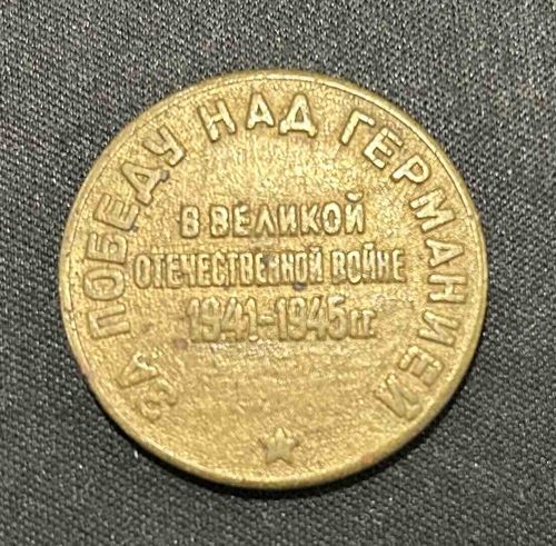 This item is the reverse side of a circular Soviet military campaign medal, established on May 9, 1945. It is constructed from brass, displaying a distinct golden-yellow hue typical of many WWII-era Soviet decorations. The coin-shaped medal has a diameter of approximately 32mm and features embossed Cyrillic text. Around the upper perimeter, it reads 'ЗА ПОБЕДУ НАД ГЕРМАНИЕЙ' (For the Victory over Germany). The center contains the horizontal inscription 'В ВЕЛИКОЙ ОТЕЧЕСТВЕННОЙ ВОЙНЕ 1941–1945 ГГ.' (In the Great Patriotic War 1941–1945). At the bottom center, there is a small five-pointed star. The surface exhibits a granular texture common in mass-produced cast or struck medals of this period. There are visible signs of aging and wear including a dull patina, minor surface scratches, and small dark spots of oxidation or 'zinc pest' beginning to form. The edges show slight smoothing consistent with handling. The absence of the suspension ribbon and the mounting ring (pentagonal block) indicates this is only the pendant portion of the award. The craftsmanship is utilitarian, reflecting the high-volume production required at the end of the conflict where millions were awarded to military personnel.