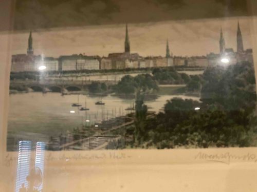 This item is an original hand-colored etching or lithograph depicting a panoramic river landscape with a prominent European city skyline in the background. The artwork features a composition with a bridge crossing the water at the mid-left, several sailboats at a pier in the foreground, and lush green trees in the lower right. The skyline is characterized by multiple Gothic-style church spires and classic nineteenth-century architecture, suggesting a Northern European city such as Hamburg, Germany (Alster Lake) or Copenhagen, Denmark. The color palette consists of muted greens, soft blues, and subtle earth tones, likely applied via hand-watercoloring over a printed base. The piece is executed on paper and is mounted within a frame under glass. Visible in the lower margin is a handwritten pencil title on the left and a cursive pencil signature on the right. While the specific name is difficult to decipher from the image, the style of the signature and the quality of the line work suggest a mid-20th-century artist specializing in topographical city views. The condition shows minor signs of age-related toning (yellowing) to the paper, particularly around the margins. There is a visible glare on the glass from the photography, but the underlying print appears intact without significant foxing or water damage. The craftsmanship reflects a high-quality decorative print intended for a gallery or specialized collector market, common in the first half of the 20th century.
