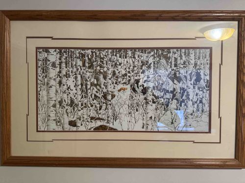 This item is a framed, limited-edition camouflage style lithograph titled 'Forest of the Grey Wolf' by the renowned artist Bev Doolittle. The artwork depicts a dense birch or aspen forest scene in a snowy landscape. The composition is a classic example of the artist's signature 'camouflage' style, where the viewer must look closely to distinguish the shapes of several grey wolves and a Native American rider on a pinto horse integrated into the patterns of the tree trunks and snow. The palette is monochromatic, dominated by whites, greys, and blacks, with a small focus point featuring a fox. The print is professionally housed in a large wooden frame with a prominent oak grain finish. It features a sophisticated triple or quadruple matting system in cream and dark brown tones, with decorative notched corners on the inner mat. While specific dimensions are not provided, the landscape orientation and substantial framing suggest a significant wall presence. The condition appears excellent with no visible fading, moisture damage, or sagging, indicating it has been kept in a climate-controlled environment behind glass. This piece likely dates from the 1980s or 1990s, representing the peak of Doolittle’s popularity in the Western and wildlife art markets.