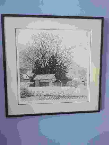 This item is a framed original drawing, likely executed in pen and ink or fine pencil on paper, depicting a serene rural landscape. The composition features a cluster of farm buildings, including a prominent barn with wooden siding and a gabled roof, nestled beneath the canopy of a large, leafless deciduous tree. The intricate linework of the bare branches suggests a late autumn or winter setting. The artwork is monochrome, relying on stippling and cross-hatching to create depth, light, and texture. It is housed in a professional gallery-style presentation with a wide, off-white or light gray mat board that provides a clean border. The frame is a modern, thin-profile black metal or wood frame with square edges. While the signature is not clearly legible in this view, it appears to be located in the lower left or right corner of the artwork itself. The craftsmanship shows a high level of detail, particularly in the rendering of the foliage and architectural textures. The overall condition appears excellent with no visible foxing on the paper or damage to the frame, consistent with a contemporary piece from the late 20th or early 21st century.