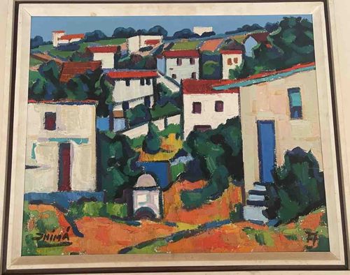 This is a vibrant mid-century modern oil/acrylic landscape painting on canvas or board, depicting a hillside village scene. The composition is characterized by its bold, expressionist style, utilizing a heavy impasto technique with thick, energetic brushstrokes that create physical depth on the surface. The color palette is dominated by Mediterranean-inspired hues, including cerulean and cobalt blues for doors and foliage, crisp whites for building facades, and terracotta reds for the rooftops, all set against a foreground of warm ochre and orange earth tones. The buildings are rendered in a stylized, geometric fashion, reminiscent of post-impressionist or fauvist influences. The artwork is signed 'NIMÁ' in the lower-left corner in a thick, dark pigment, and also features a stylized monogram or date '77' in the lower-right corner, suggesting the work was created in 1977. The painting is housed in a contemporary-to-era wooden frame consisting of a light-colored inner liner and a darker outer edge. Regarding condition, the paint surface appears stable with some minor cracking consistent with age; the frame shows light scuffing and minor discoloration on the linen/wood liner. The overall craftsmanship reflects a confident hand with a strong grasp of color theory and architectural simplification, typical of professional European or Latin American studio art from the late 20th century.