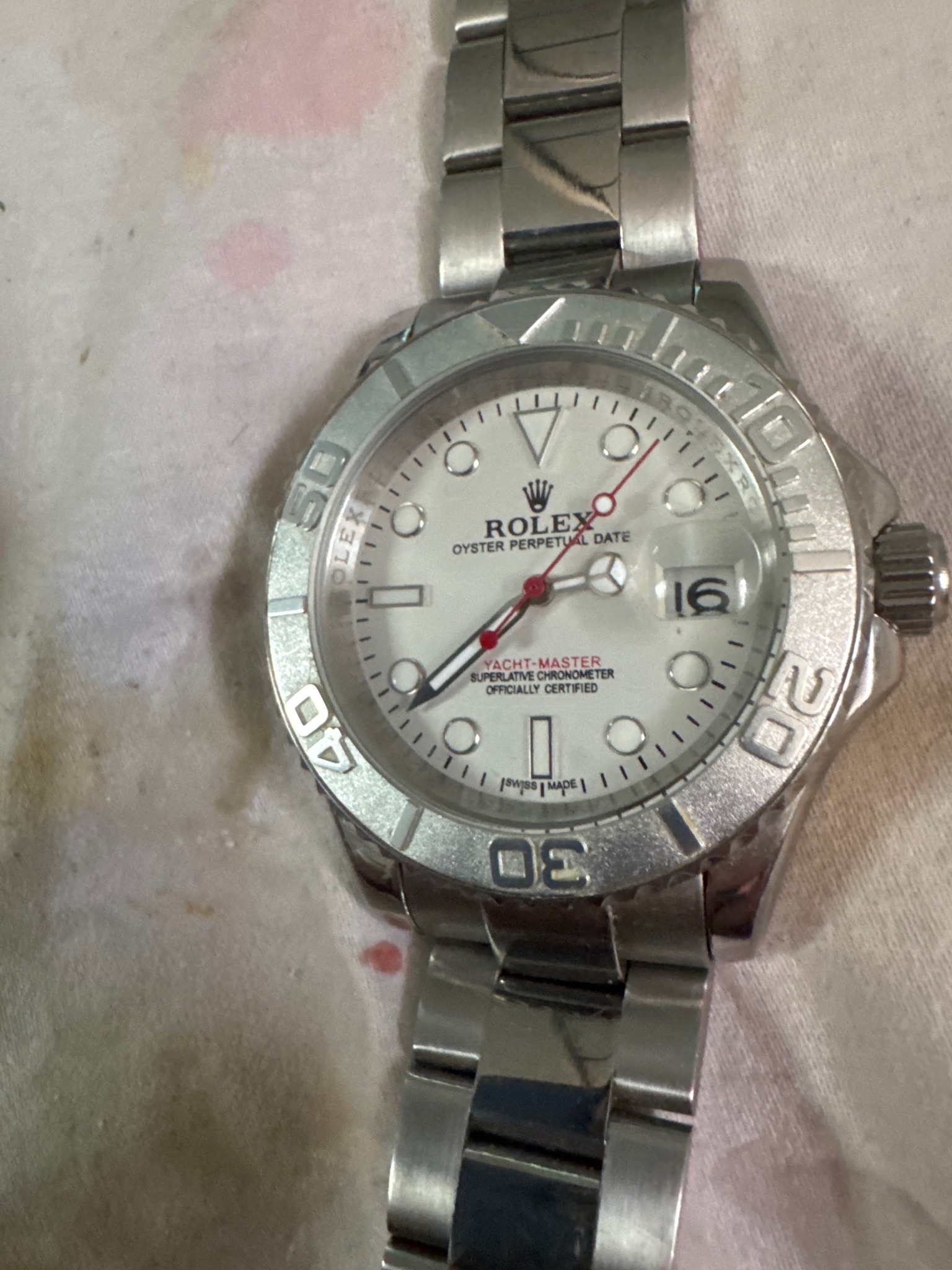 This item is a wristwatch styled after the Rolex Yacht-Master Oyster Perpetual Date. It features a stainless steel-toned case and a matching Oyster-style bracelet with polished center links and brushed outer links. The watch has a white dial with applied circular, rectangular, and triangular hour markers, a distinctive red seconds hand, and a date window at the 3 o'clock position magnified by a cyclops lens. The bidirectional rotatable bezel features raised polished numerals and graduations against a sandblasted background. Notable markings include 'ROLEX OYSTER PERPETUAL DATE', 'YACHT-MASTER', and 'SUPERLATIVE CHRONOMETER OFFICIALLY CERTIFIED' printed on the dial, along with the coronet logo and 'SWISS MADE' at the bottom. However, several quality indicators suggest this is a counterfeit reproduction: the magnification of the date appear off-center or weak, the 'ROLEX' engraving on the rehaut (inner ring) is misaligned with the hour markers, the typography on the dial is slightly inconsistent with authentic luxury standards, and the overall fit and finish of the steel components show rough edges and irregular reflections. The condition includes visible surface scratches on the bezel and bracelet links, indicating moderate wear.