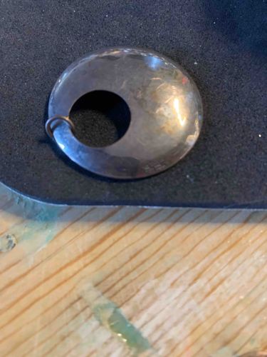 This item is a circular, domed metal pendant, likely crafted from sterling silver or a similar silver-toned alloy. It features a distinctive asymmetrical, off-center circular cutout, giving it a modern, organic aesthetic. The surface exhibits a subtle hammered texture, which creates a multifaceted reflection of light across the domed face. The piece is constructed from a thin sheet of metal that has been shaped into a convex form. Attached through a small hole at the edge of the cutout is a simple jump ring, which would serve to hang the piece from a chain or cord. The metal shows visible signs of age and wear, including significant surface scratching and a dark patina of tarnish, particularly visible around the edges and within the depressions of the hammered texture. There are no clearly visible maker's marks or hallmarks on the front surface; any such identifications would likely be found on the reverse side. The style is characteristic of mid-century modern or contemporary artisan jewelry, focusing on geometric simplicity and hand-wrought textures. The overall quality suggests a hand-crafted studio piece rather than a mass-produced item, evidenced by the slight irregularities in the hammered finish and the placement of the internal cutout.