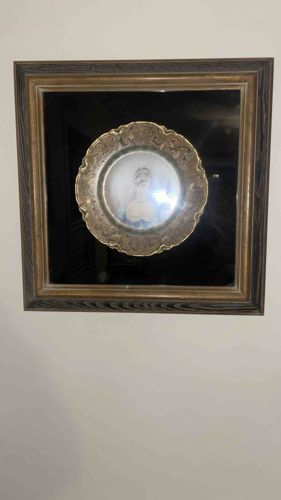 This item is a decorative porcelain cabinet plate featuring a central hand-painted or decal-transfer portrait of a noblewoman, set against a black velvet shadowbox background within a professional wood frame. The plate demonstrates a scalloped edge with a heavy, coin-gold or gilt-over-bronze rim showcasing intricate embossed scrollwork and floral motifs. The central figure appears to be in an 18th-century style, possibly depicting a figure like Marie Antoinette or a similar European noble, typical of late 19th or early 20th-century 'Vienna Style' or 'Dresden' porcelain production. The frame is a substantial square wood molding with a dark, grained finish and a burnished metallic inner liner. Regarding condition, the gilt on the porcelain shows significant reflective properties, suggesting well-preserved luster, though some minor rubbing of the gold might be expected given the age. The wood frame exhibits some surface dust and minor scuffs consistent with display. The shadowbox mounting provides a high-quality presentation, indicating the piece was valued as a work of fine art rather than utility. The craftsmanship of the embossed rim suggests a high degree of skill, likely originating from a European factory such as Royal Vienna, Hutschenreuther, or Sèvres, though specific maker's marks are obscured by the mounting.