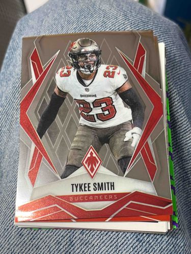This is a contemporary sports trading card featuring Tykee Smith of the Tampa Bay Buccaneers, part of the Panini Phoenix football card line. The card features a high-gloss finish typical of modern opti-chrome cards. Smith is depicted in his Buccaneers away white uniform, wearing Jersey #23. The design utilizes a distinctive 'Phoenix' aesthetic, characterized by sharp geometric lines and a red-and-silver color palette that frames the central player image. A stylized phoenix logo is prominently displayed at the bottom center, just above the player's name and team designation. The background features a textured, diamond-patterned grey gradient. Physically, the card appears to be standard size (2.5 by 3.5 inches) and is printed on thick cardstock. Looking at the condition through the photograph, the card shows relatively sharp corners, though there appears to be slight edge wear on the right side. The centering seems slightly shifted towards the bottom. There are no visible creases or heavy scratches from this angle, though surface micro-scratches are common for this high-sheen series. As a rookie-year prospect card (2024), it represents the modern era of sports memorabilia production from Panini, known for high-quality printing and intricate graphic design.