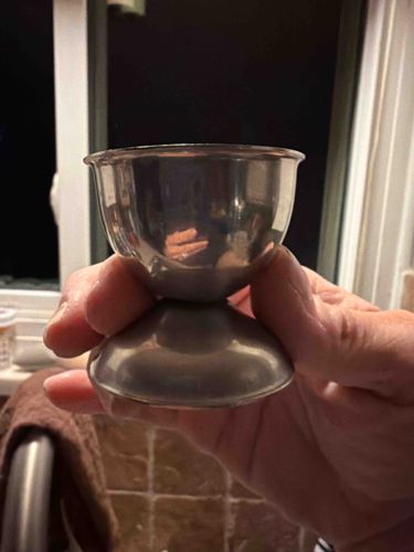 This item is a contemporary pedestal-style egg cup designed for holding a soft-boiled egg. The piece is constructed from a polished metallic material, likely stainless steel or chrome-plated metal, characterized by a cool-toned, reflective silver finish. It features a classic hourglass silhouette consisting of a rounded, hemispherical bowl top and a flared, trumpet-style circular base joined at a central narrow waist. The top rim is slightly rolled or flared outward for comfort and ease of use. In terms of size, it appears to be approximately 2 to 2.5 inches in height, consistent with standard tableware proportions. The construction shows smooth, seamless surfaces without ornate engravings or embossed patterns, suggesting a modern or mid-to-late 20th-century aesthetic focused on functionality and minimalism. Condition-wise, the item exhibits light surface scratching and micro-abrasions typical of regular use and cleaning. There are no visible dents, major deformations, or signs of heavy oxidation, though fingerprints are prominent on the highly reflective exterior. While no maker's marks are visible in the provided angle, this style is common in European hotelware and domestic kitchen collections from the 1970s onwards. The overall craftsmanship is industrially consistent, providing a sturdy and balanced vessel for dining.